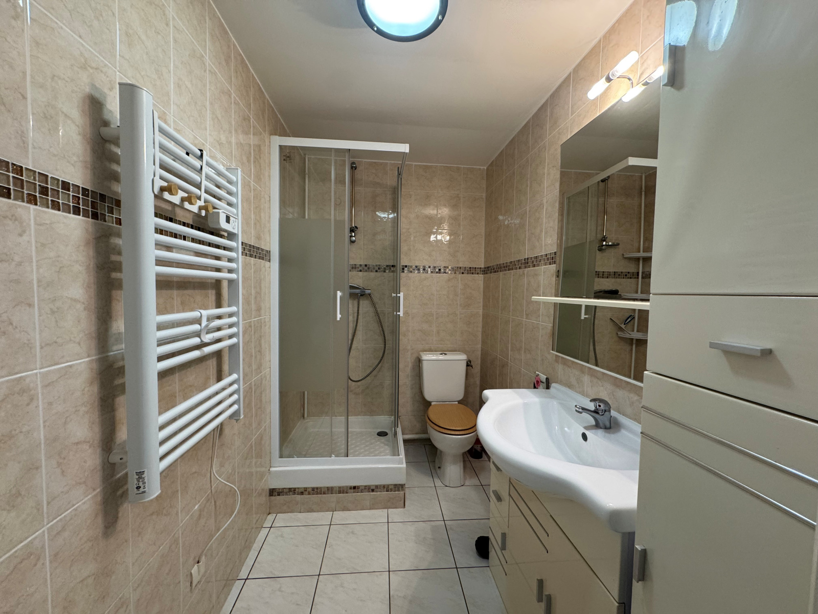 Vous disposerez d'une jolie salle d'eau parfaitement bien entretenue avec douche, porte serviette chauffant, vasque, des rangements et WC.