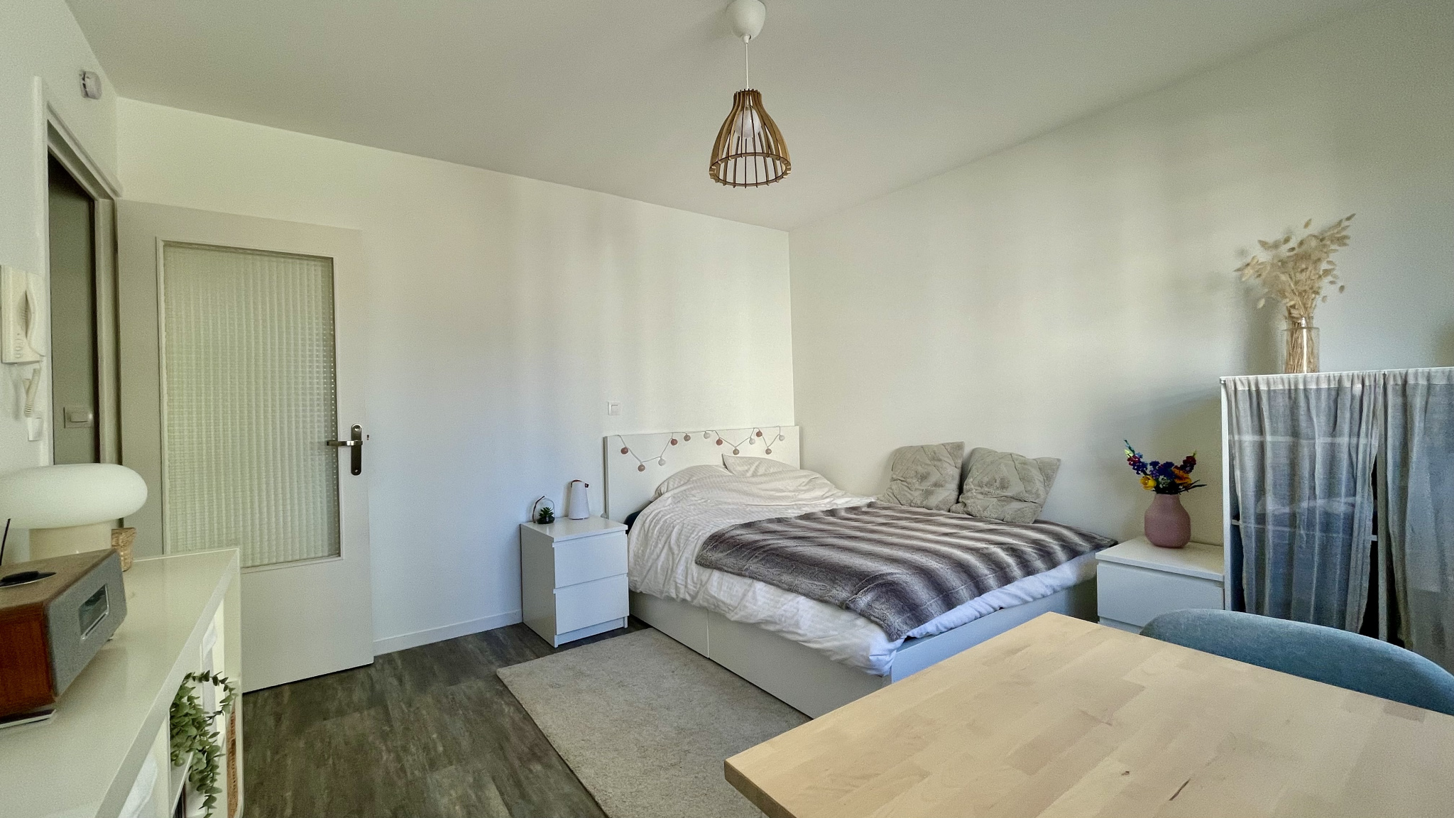 L’appartement se compose d’un séjour lumineux, parfaitement agencé et ouvert sur une belle cuisine équipée, offrant un espace de vie agréable et fonctionnel. Il dispose également d’une salle de bains avec douche, d’un WC ainsi que de nombreux rangements optimisant l’espace.