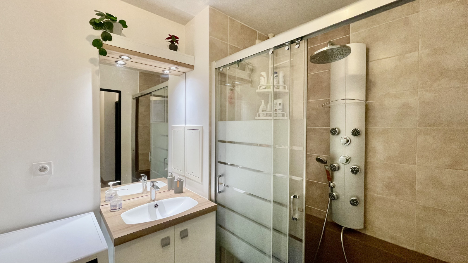 La partie nuit comprend trois chambres confortables. La salle d’eau moderne est équipée d’une douche à l’italienne et de rangements, offrant confort et élégance au quotidien.
