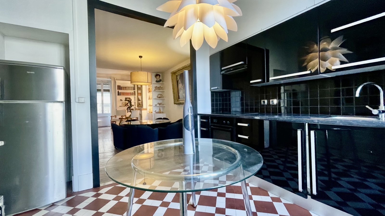 Une élégante galerie d’entrée distribue un vaste salon baigné de lumière avec coin salle à manger et double exposition, ainsi qu’une très jolie cuisine semi-ouverte, entièrement équipée.