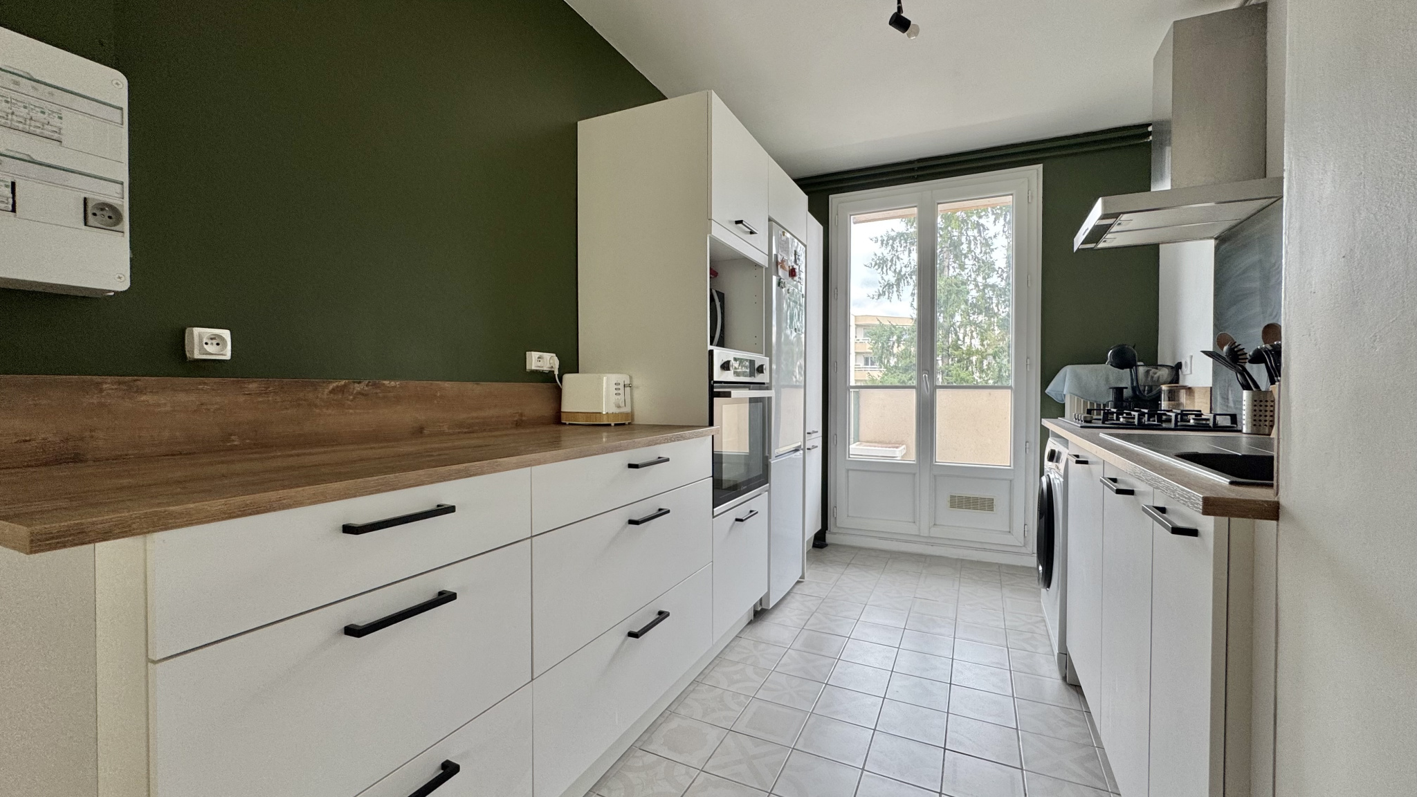 Le séjour, exposé plein sud et d’une surface généreuse de 21 m², s’ouvre sur un grand balcon à vivre qui permet de profiter pleinement du soleil tout au long de la journée. La cuisine moderne et entièrement équipée bénéficie elle aussi d’un accès direct à un second balcon, offrant ainsi une surface extérieure totale d’environ 11 m² idéale pour les beaux jours.