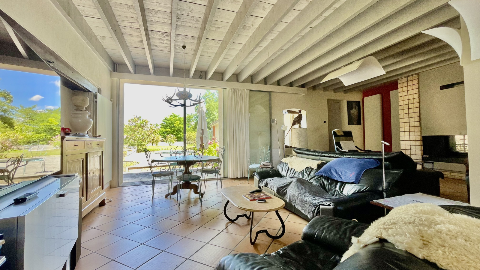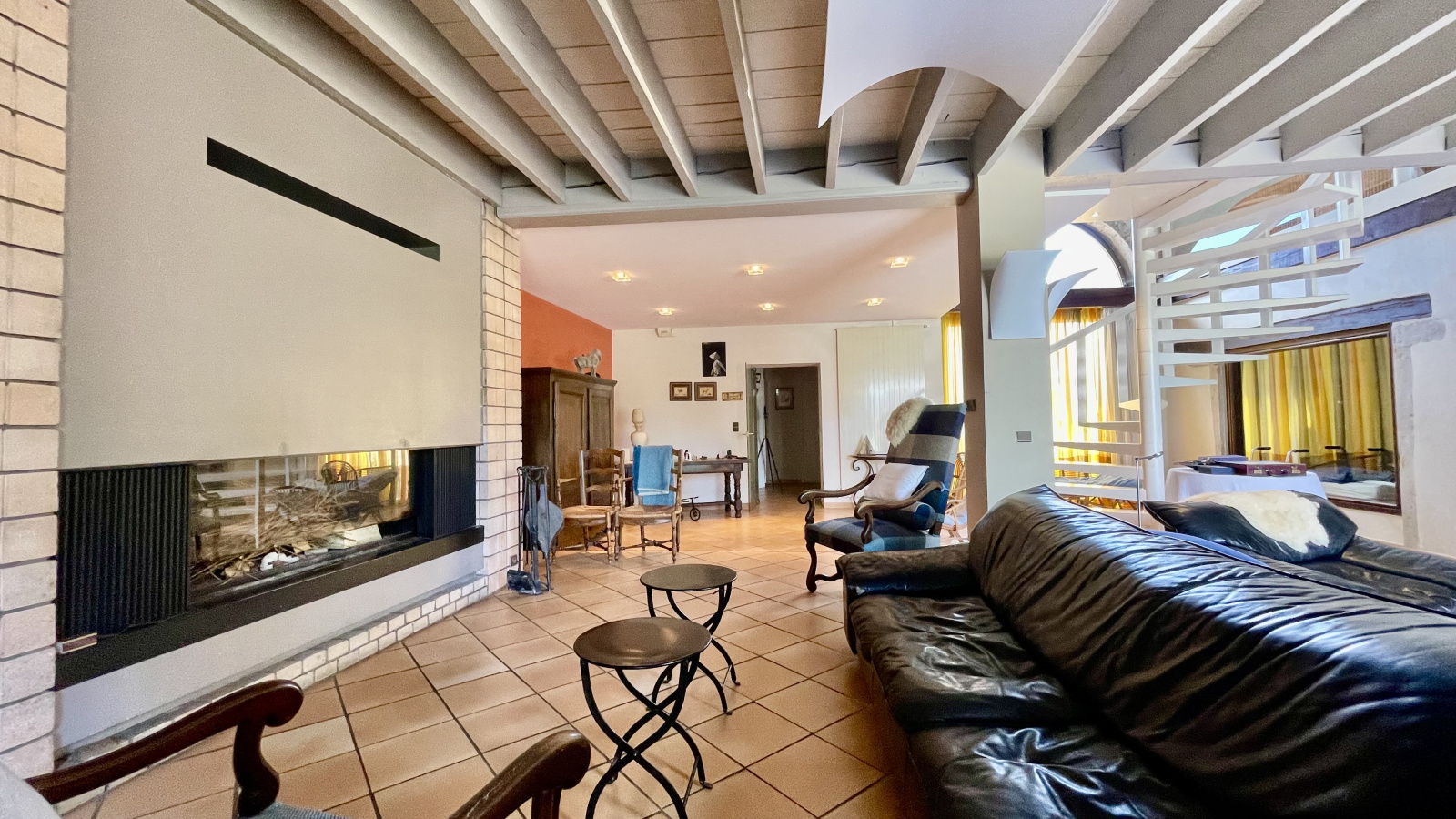 Au rez-de-chaussée, un vaste séjour traversant, apprécié pour sa belle hauteur sous plafond, sa luminosité constante et sa cheminée, crée une atmosphère chaleureuse et conviviale.