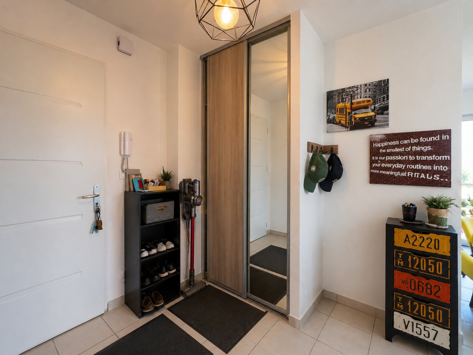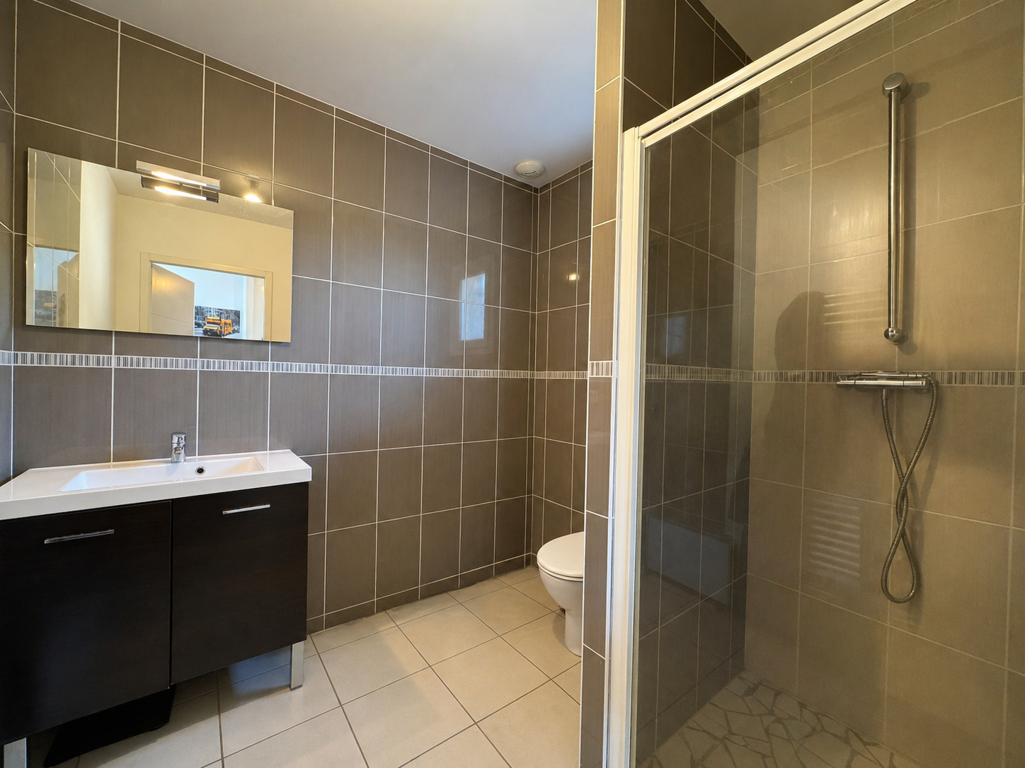Au rez-de-chaussée, vous trouverez une entrée avec placard ainsi qu'une salle d'eau équipée d'une douche à l'italienne. La pièce de vie se compose d'un grand séjour salon et d'une cuisine US équipée. Un autre placard est astucieusement situé sous l'escalier pour optimiser le rangement.